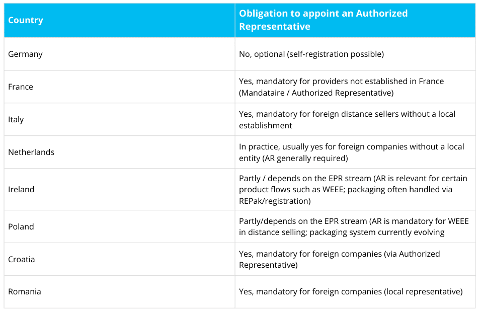 Although the EU aims to harmonize regulations, starting points vary across member states. In some countries, EPR systems have been long established and strictly enforced, while in others they are only now being developed. These differing national approaches lead to significant variations in how EPR reporting obligations are managed. For example, in some countries, appointing an authorized representative in the destination country is mandatory, whereas in others it is not. You can see the outcome here: